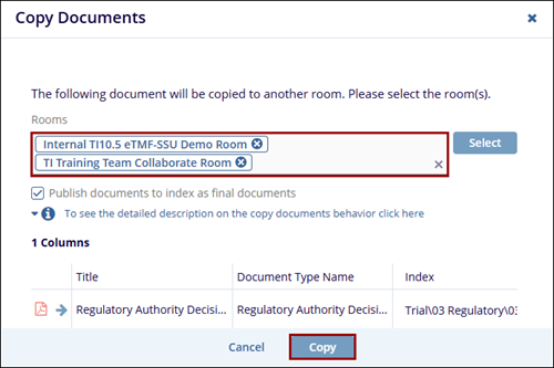 Trial Interactive allows Cross-Study Copy of Documents through this functionality. When users select the Copy to Other Rooms option from the Documents Cart, selected documents as well as their metadata will be copied to other rooms: