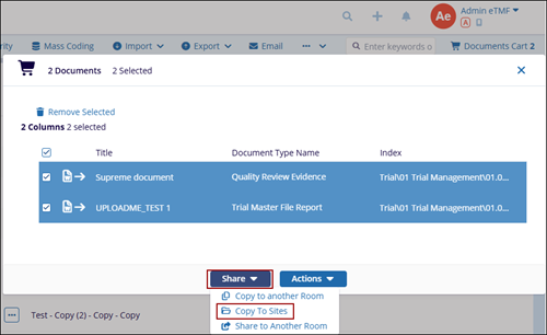Administrators can access the documents cart to avoid copying documents such as training documents individually across different investigative sites.