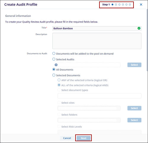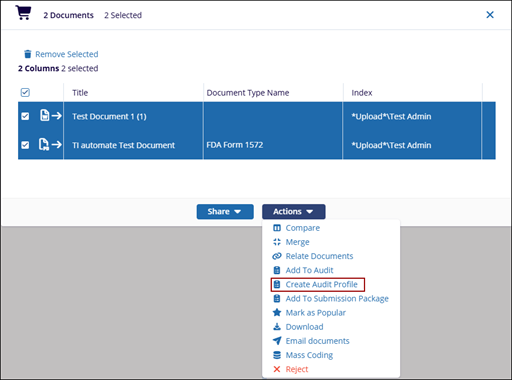 Admins can add documents to the cart from the grid and create audit profiles using the Create Audit Profile option.