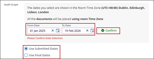 - In the Audit Scope section, set a time window with a Start and End Date and click the Confirm button to validate it.