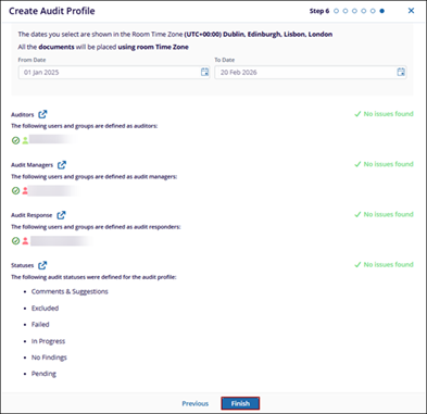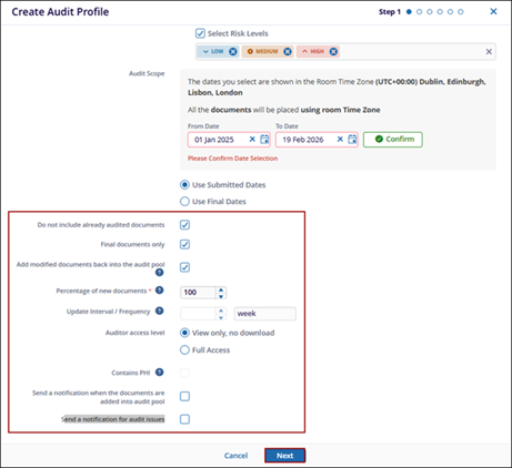 - Check the Final documents only checkbox to enable inclusion of final documents only. This checkbox is activated if Use Final Dates is selected in Audit Scope.