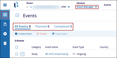 - Planned: This tab displays the planned events, with the event name, event type, planned date, etc.