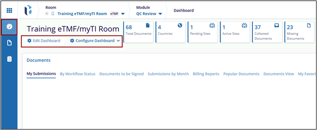 Each room displays a format configurable dashboard to all users and display dashlets providing study room information and reporting data. The Dashboard allows users to customize their workspace by adding, removing, or rearranging tabs based on user preferences. Administrator-level users can configure default dashboards for users according to the user access levels. Unless restricted, users can modify their dashboards to suit the user's needs.