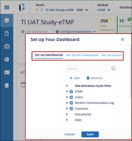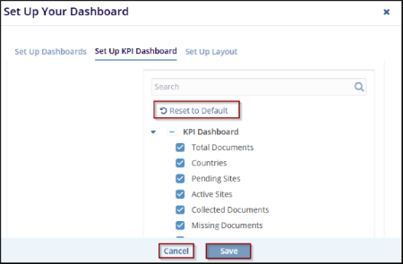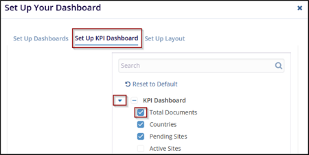 The Set Up KPI Dashboard allows users to configure key performance indicator (KPI) metrics on the user’s dashboard. The selected dashlets are displayed on the top right corner of the screen.