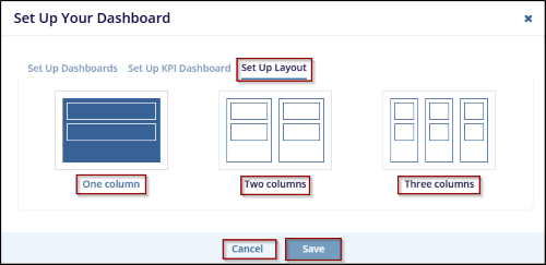 The Set Up Layout allows users to customize the visual structure of the dashboard by choosing a column-based layout. This ensures that the dashboard is organized according to user preferences. The user has the option to select from – One, Two, or Three Columns.