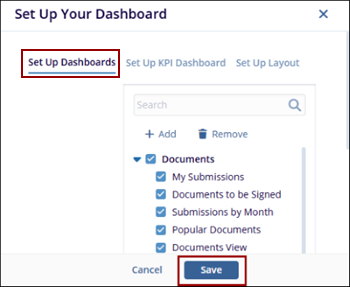 the popup window to apply the changes.Note: The checkbox(s) selected for each dashlet from the set up your dashboard window will only display those tabs in the Dashboard.