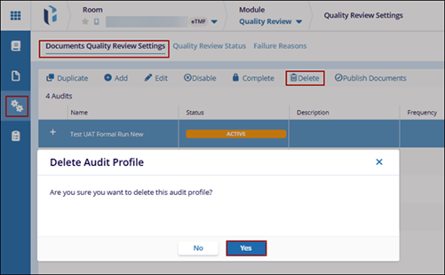 - Click on Yes, on the Delete Audit Profile confirmation pop-up.
