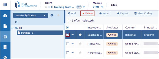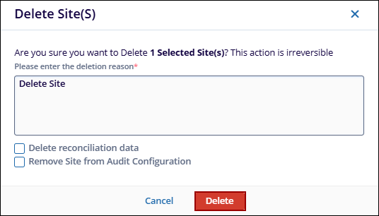 On the Delete Site(s) dialog, enter the reason for deletion in the provided field. Optionally, select Delete reconciliation data or Remove Site from Audit Configuration if applicable.