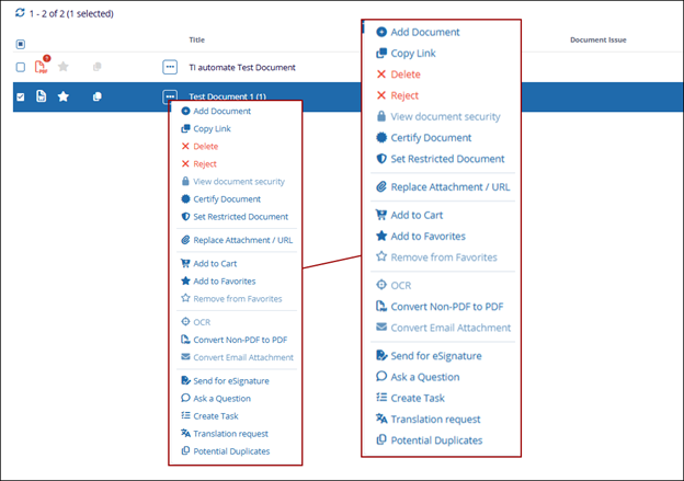 The Document Activities Menu provides access to various actions based on the user’s access rights. To open this menu, select a document or placeholder from the Grid and either right-click or click on the three-dot menu.