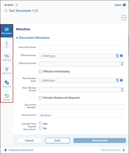 From the metadata panel located at the right of the documents grid, users can view the following tabs after selecting a document from the grid.