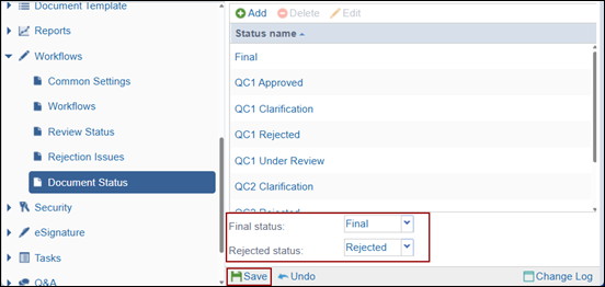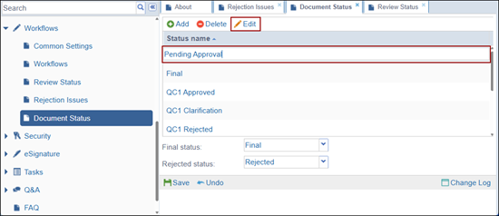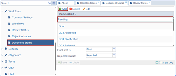 Within the Document Status section, administrators can add, edit, or delete statuses that can be assigned to documents. They can also define the final status that a document receives upon approval. This section displays the list of status names currently configured for document.