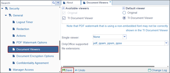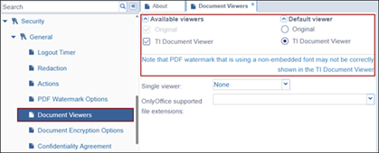 - Expand the Security > General settings dropdown and select the Document Viewer option.