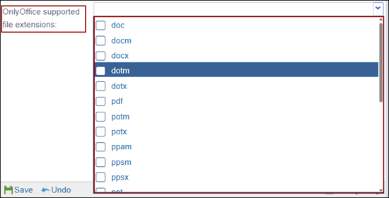 - Click the dropdown next to OnlyOffice supported file extensions and choose the