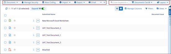 This menu is located at the top of the Documents module and allows access to various functionalities on documents: