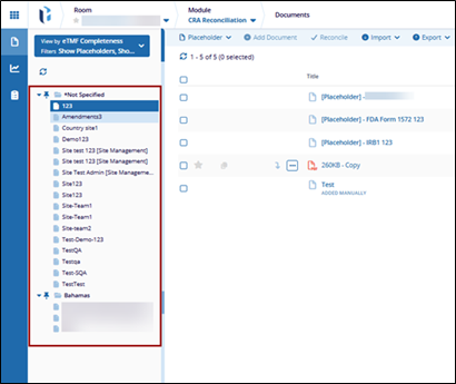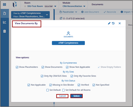 The Documents tab within the CRA Reconciliation module enables users to configure placeholders, add documents to the placeholder, reconcile documents by applying the statuses and perform other common functions such as import, export, email, manage grid views and add documents to the document cart.