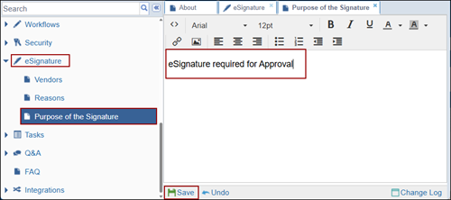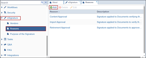The system shall have an Out-of-the-Box 21 CFR Part 11 compliant Electronic Signature, which appends a signature manifestation page to the document. Within the eSignature settings, administrators can define the eSignature vendor, reasons and the purpose of eSignature.