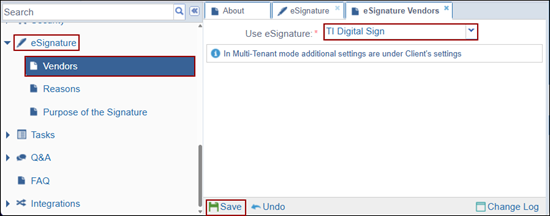 The e-signature vendor available to the user is determined by the vendor selected by the organization.