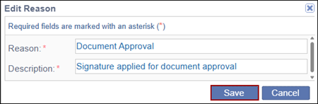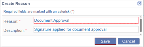 - On the Create Reason pop-up, mandatorily specify the reason and description.