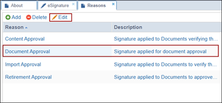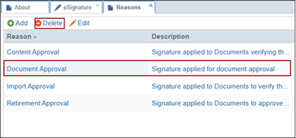 When e-signing a document, e-signers must specify the reasons for approving or declining it. Administrators can configure the available reasons for e-signature from this section.