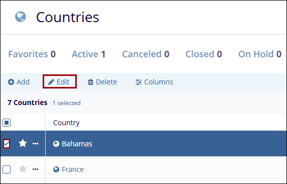 - On the Countries screen, select the country to edit by checking the box next to its name.