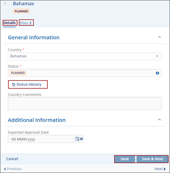 - Under General Information, update the Country name and Status if needed.