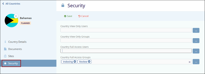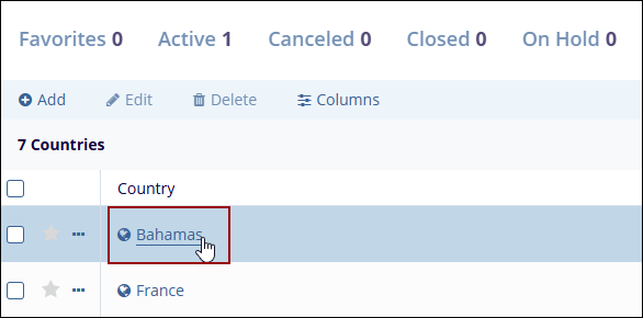 - On the Countries screen, click on the country name to edit.