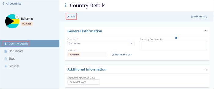 - On the Country Details screen, Click on the Edit button.