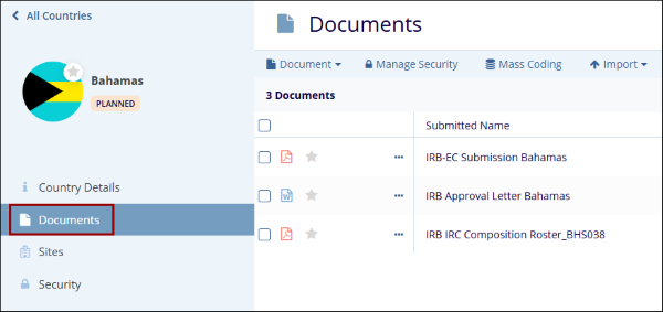 To edit a country in the eTMF module, follow one of the methods below.
