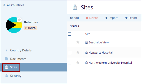 - Click on the Sites tab to view the sites associated with the country.