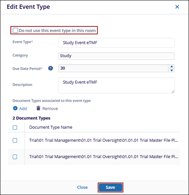 - On the Edit Event type window, update the event details and add or remove the document types.