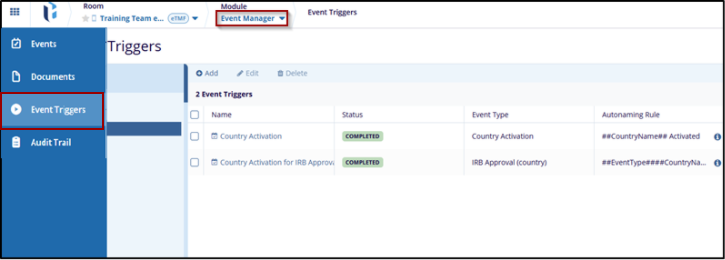 An Event Trigger display folder that carried statuses of each event at the study, country, and site levels.