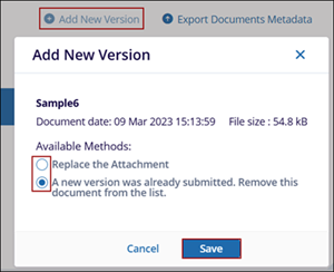 - If the user selects the radio button 'A new version was already submitted. Remove this document from the list'. Nothing else needs to be done. The document will be removed from the list of expiring documents.