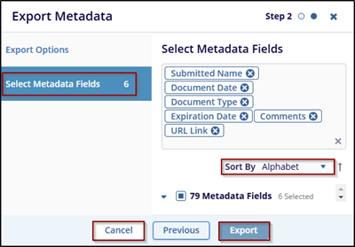 - Click Next to proceed to Select Metadata Fields, where the user can choose the Metadata fields to include in the export.