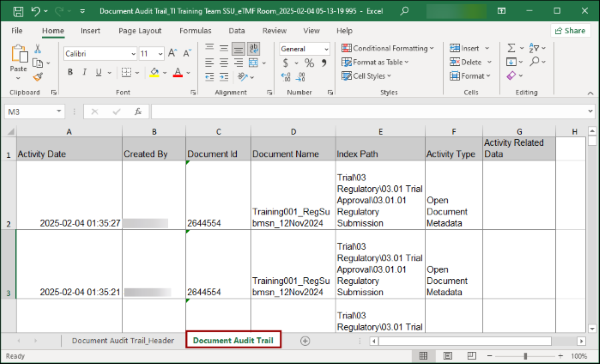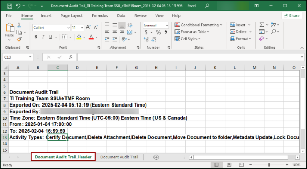- On the downloaded file, click on the Document Audit Trail_Header tab to view the