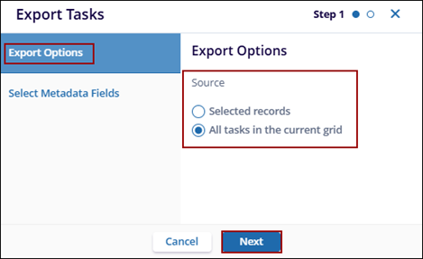 - All Tasks in Current Grid: Exports all records currently displayed in the grid.