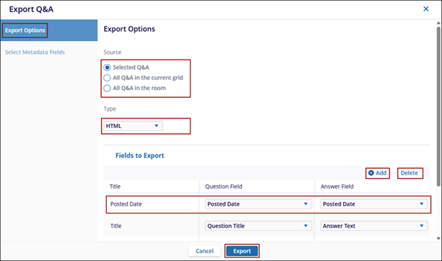 On the Export Q&A window, select a source from the following by clicking its radio button.