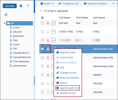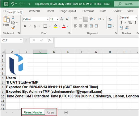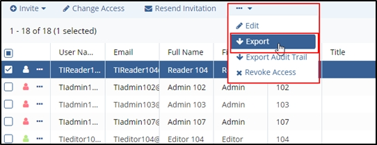 The Export option allows administrators to download the user list and related user details for offline review, reporting, or documentation purposes. This feature is useful for maintaining records of users added to the study/room and their assigned access information.