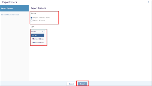 - Select the Type of export file format, the user can select HTML, Microsoft Excel, or