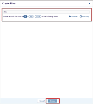 - On the Create Filter screen, enter a title for the filter and click the + Add