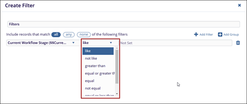 - On the Filters screen, select the filter and it appears in the right pane with +Add,