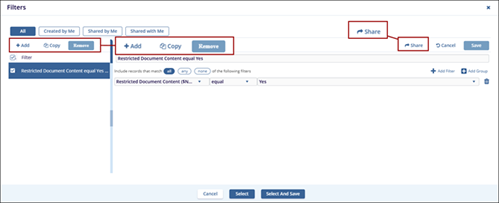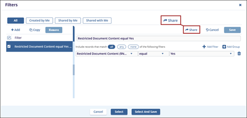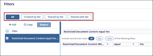 Users can view the filters that are created, shared by and shared with them by clicking the required tabs in the Filters window.