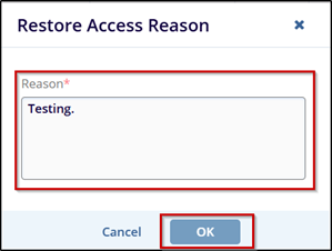 - The Restore Access Reason confirmation window appears. Enter a reason for restoring