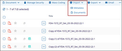 The Metadata Import option allows users to import metadata associated with documents, such as document type, category, country, or other key data. It enables the system to update or create metadata records in bulk, ensuring that documents are properly categorized and searchable.