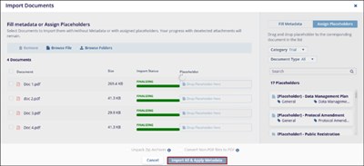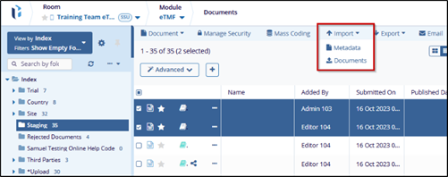 The Import function allows users to bring documents into the room, where permissible, the function also allows for the import of metadata and documents. If the user has selected a specific target folder in the index pane, the import window will populate with appropriate metadata in anticipation of that folder being the desired final location of the document.