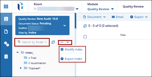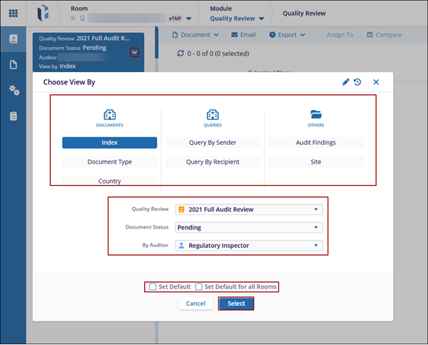 View Name Description Documents Index Allows users to view or filter documents included in the index folder. Document Type Provides the option to view documents by their categories (e.g., Trial, Country, Sites, etc.). Country Allows users to filter documents based on the country associated with them. Queries Query By Sender This enables users to view queries based on who sent them. Query By Recipient Allows filtering of queries based on the recipient. Others Audit Findings This option is likely for viewing documents or queries related to audit results or findings. Site Filters content based on the associated site (possibly for multiple site-based documents or records). - Click the Quality Review dropdown and choose the applicable audit profile.