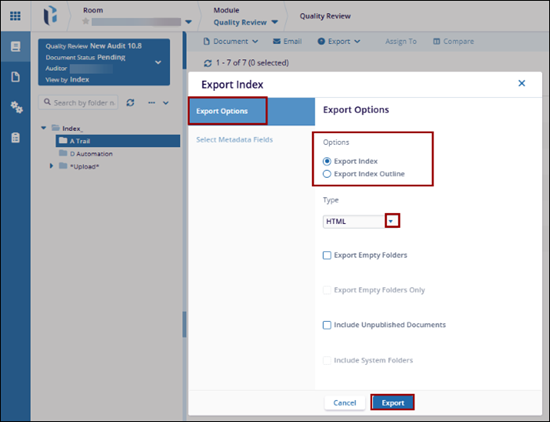 The Room Index is structured as a tree-like system, with Index as the root folder. It consists of parent and child folders, which can either be cloned during room creation or created from scratch. Here users can create folders and subfolders to configure the index structure and export the index structure in either HTML, Excel or Word formats.