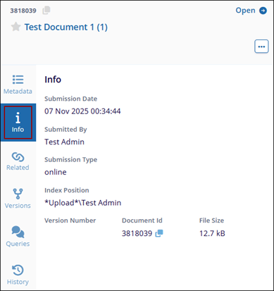 The Info tab within the Metadata panel of a document provides a comprehensive overview of key document details. This tab includes essential document information that help users track documents details. The information includes the following.