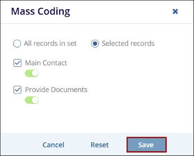 The Mass coding functionality allows users to apply metadata updates in bulk to all or selected contacts.