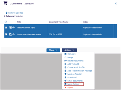 The Mass Coding function, allows the user to apply metadata to multiple documents at the same time. If the Causality Tracking feature is enabled in the room, then Mass Coding will be disabled.