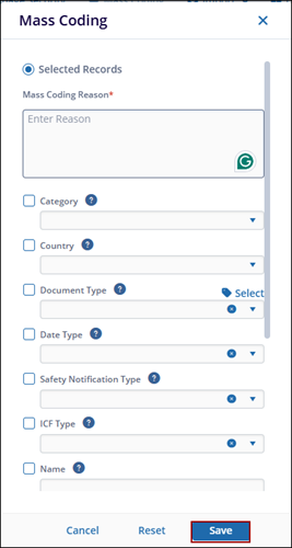The Mass Coding pop-up window is displayed. Fill in all the required fields and click the Save option.